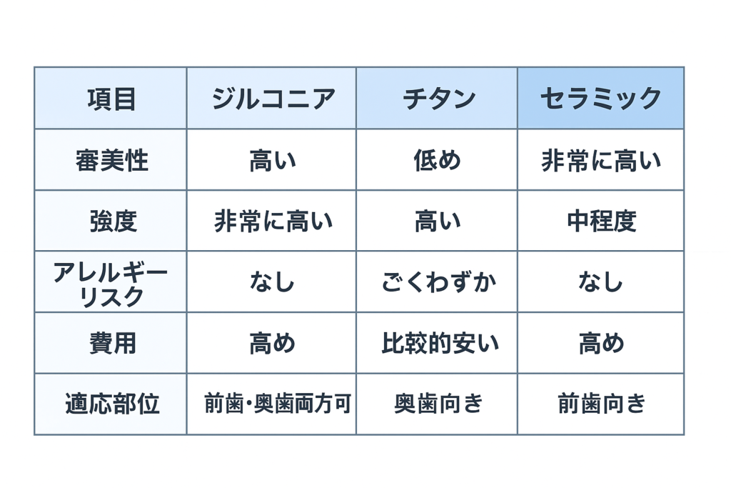 ジルコニアはバランスの良い高機能素材、チタンは耐久性とコスト重視、セラミックは審美性重視と覚えておくと選びやすくなります。